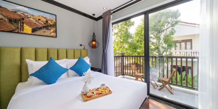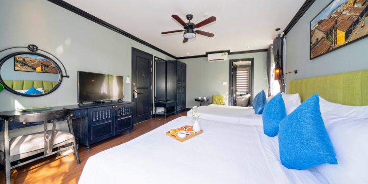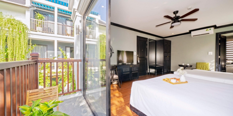 Possessing a spacious balcony and windows with picturesque views of the pool and neighborhood, the open-plan design Deluxe Triple with Balcony is an ideal choice for a group of traveller or small family looking for great comfort and convenience at An Bang Beach. This room comes with a king size bed, an en-suite bathroom with separate rainforest shower and tub and a sitting area. An extra rollaway bed is available upon your request.